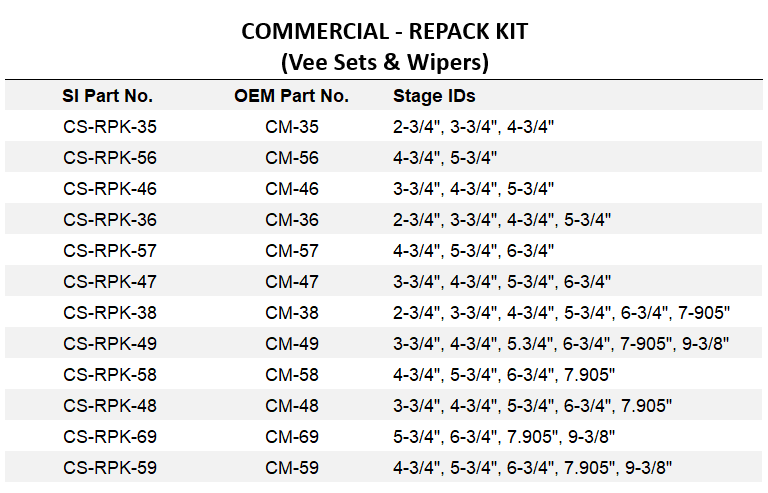 Quick view Details sku: CS-RSK-80 CS-RSK-80, Commercial Telescopic Seal Kit, Vee Packing Set & Wiper (CM-8VSW) MSRP: $107.50 Now: $80.65 Add to Cart