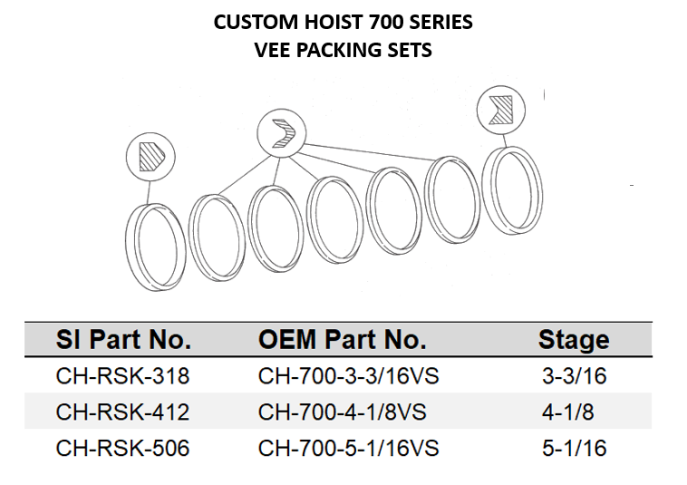 Quick view Details sku: CH-RSK-60 CH-RSK-60, Custom Hoist Telescopic Seal Kit, Vee Packing Set & Wiper (CH-6VSW) MSRP: $47.80 Now: $35.85 Add to Cart